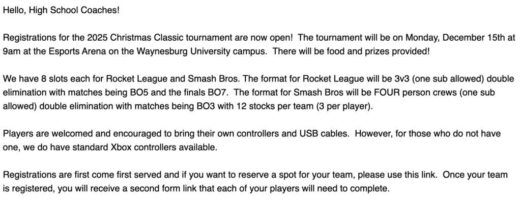 Upcoming In Person TournamentsBy Monica Erwin / October 27, 2025 Registration Link for Waynesburg University.
